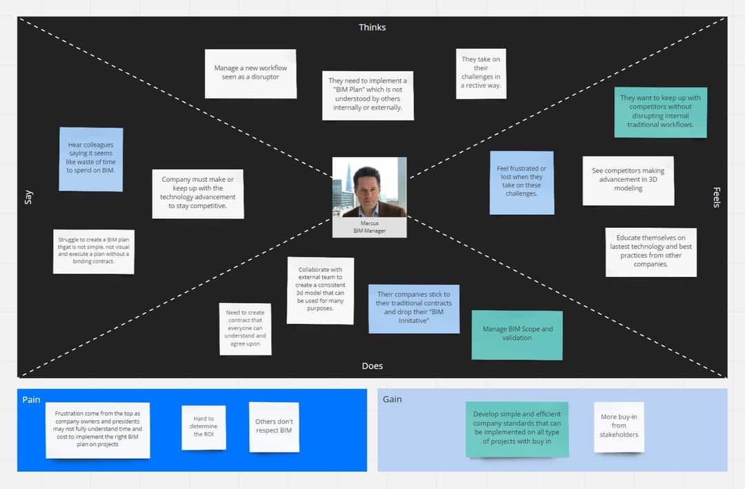 The Empathy map helps the team to understand 'A Day in Life' of a BIM manager, and show user’s perspective regarding the tasks related to the product.